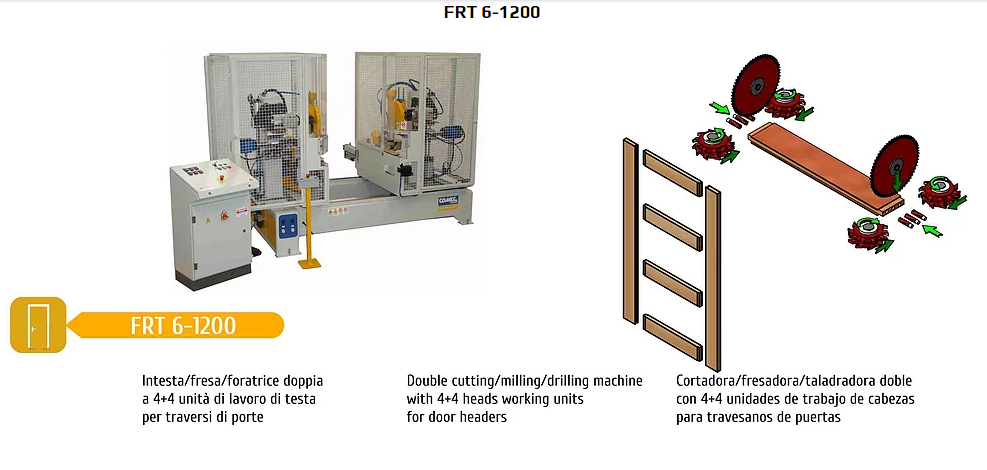 Двусторонний торцовочно-сверлильно-фрезерный станок с 4+4 рабочими узлами для обработки поперечин дверей
