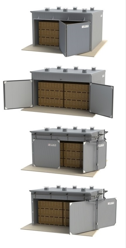 ►Загрузочные ворота. В стандартной комплектации сушильные камеры SECAL снабжены алюминиевыми подъемно-откатными воротами с гидравлическим подъемником. Перемещение ворот может быть по линии в сторону или же дугообразно с открытием ворот вдоль боковой стенки камеры. Ворота могут быть также ввиде раздвижных дверей, складных или распашных дверей;