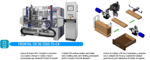 Обрабатывающий центр мод. FRONTAL CN 3U – 1500 2S + CA с ЧПУ. 2 рабочие зоны, податчик, 2 фрезерных узла и 1 сверлильный узел для обработки передних элементов ящиков.