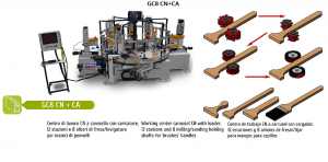 Карусельный обрабатывающий центр с ЧПУ, податчиком, 12 рабочими зонами и 8 фрезерными и шлифовальными шпинделями для обработки рукояток кистей.