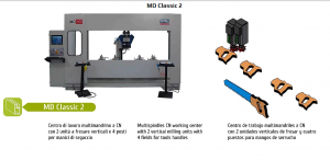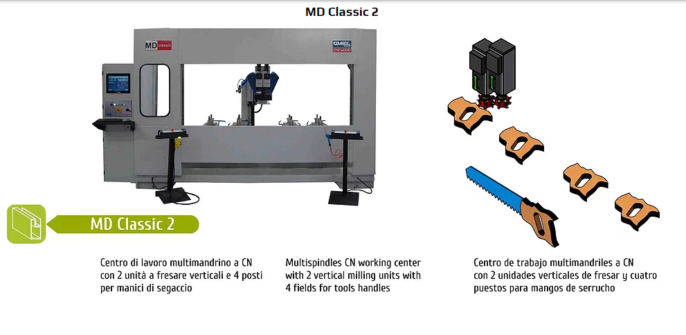 Многошпиндельный обрабатывающий центр с ЧПУ с 2 вертикальными фрезерными узлами и 4 местами для рукояток ножовок.