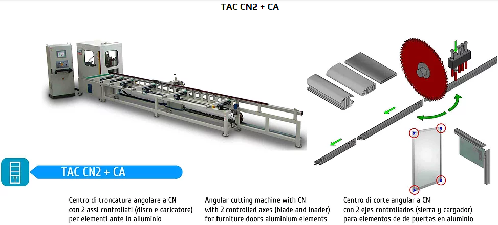 Угловой отрезной центр с ЧПУ с 2 управляемыми осями (диск и податчик) для обработки фасадов из алюминия.