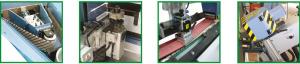 Simple and versatile use combined with a modular construction system permit this machine to be personalised and equipped according to specific needs and use. The machine, in fact, can be equipped with milling units, sanding belts, superfinishing sanding units, disk sanding machines, milling and belt chamfering units and, where necessary, specially constructed operating units. The high quality of the materials used for construction and the distinguishing technical and machining specifications ensure a high level of precision and reliability. The machine operates with a high precision chain transmission. This system is made up of rectified support links, connect with rectified secured pins complete with pin cushions and lubrication system and rubberised plates with high coefficients of friction. An electronic unit controls the cross movement of the mobile column as well as the entrance and exit of the pad, abrasive disk and bi-directional recovery of abrasive disk wear. The machine is equipped with a controlled axis opening. Additionally, both the belt and abrasive disk sanding machines are equipped with special systems that ensure constant sanding pressure during all machining phases. Among the various available options we would like to point out: the motorisation for work unit movements, computerised control of unit positioning, the inverter to vary the rotation speed of the single units and our patented self-settling system of the counter-shape on belt sanders that reduces equipment assembly time on each single unit by 50%. |