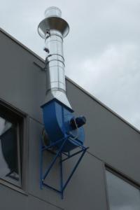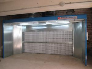 Independent dry painting booth with activated charcoals air filters.